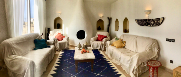 Das charmante Haus ist mit seinen nur vier Gästezimmern eine wahre Ruheoase über dem Meer: Die gemütliche Sitzecke im Salon, der Innenhof und die Dachterrasse bieten viel Raum zum Entspannen, Lesen oder für anregende Gespräche mit anderen Gästen und den Gastgebern. In der Küche des Hauses werden für Sie typisch marokkanische Gerichte zubereitet.
